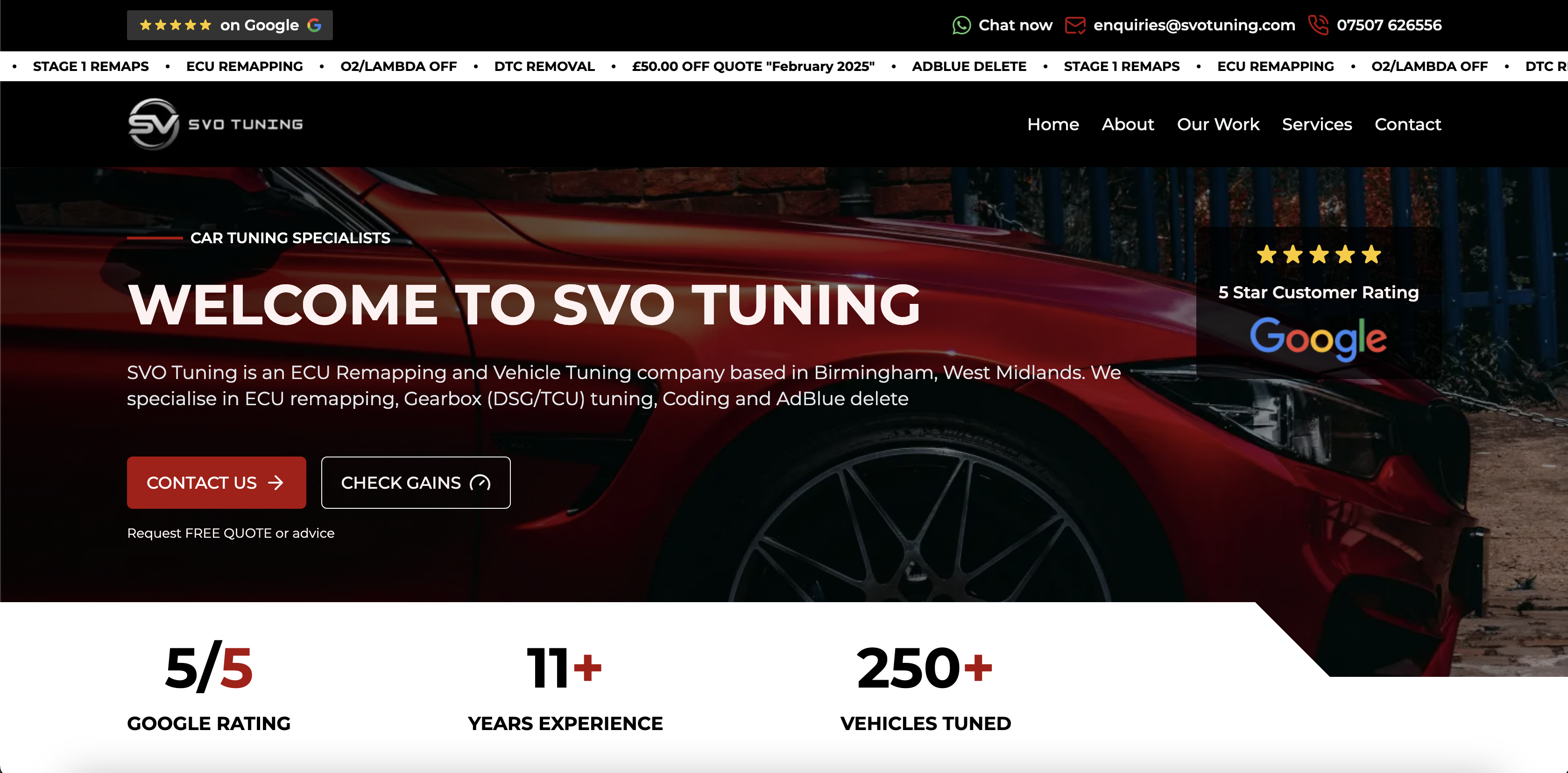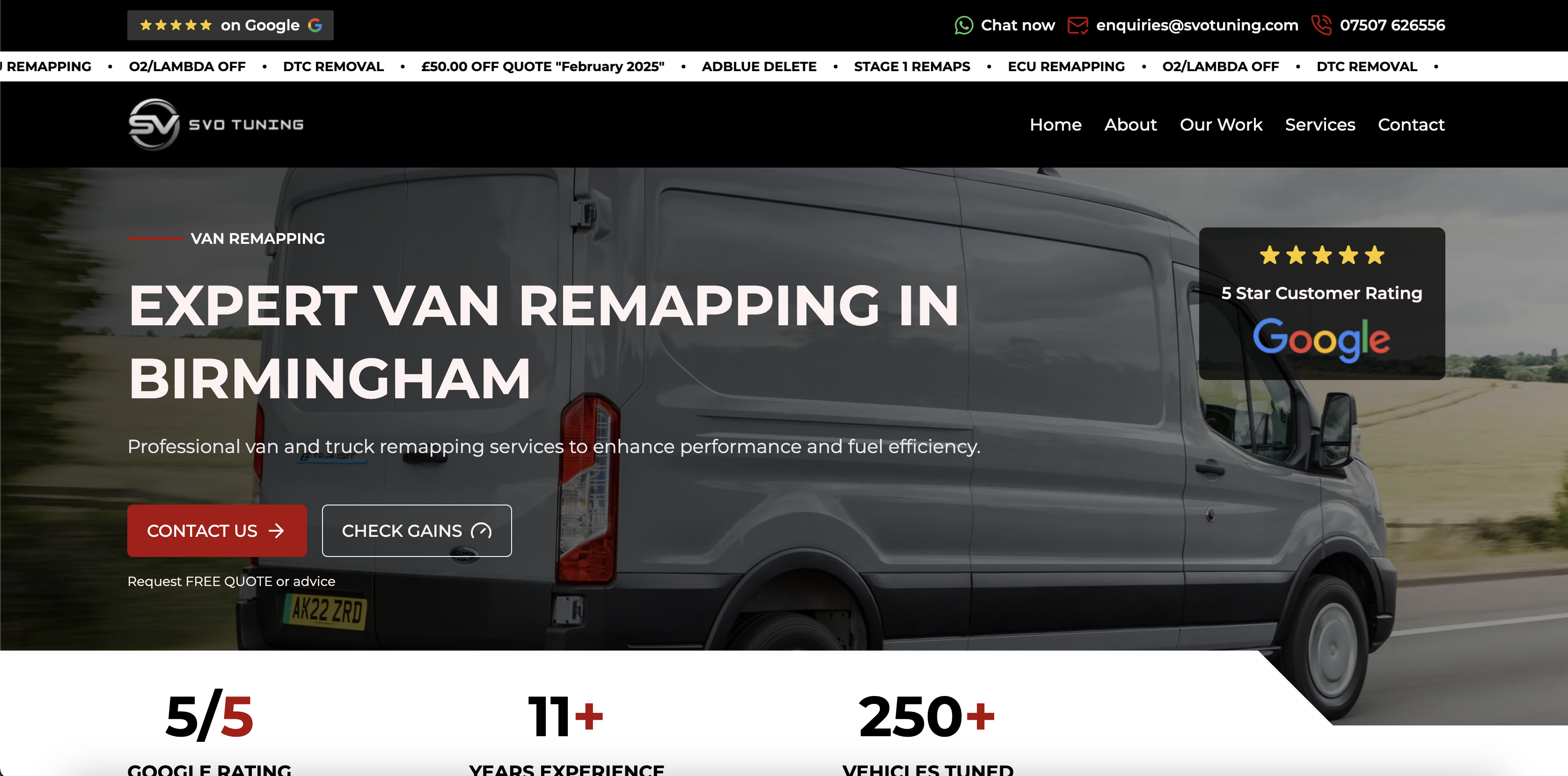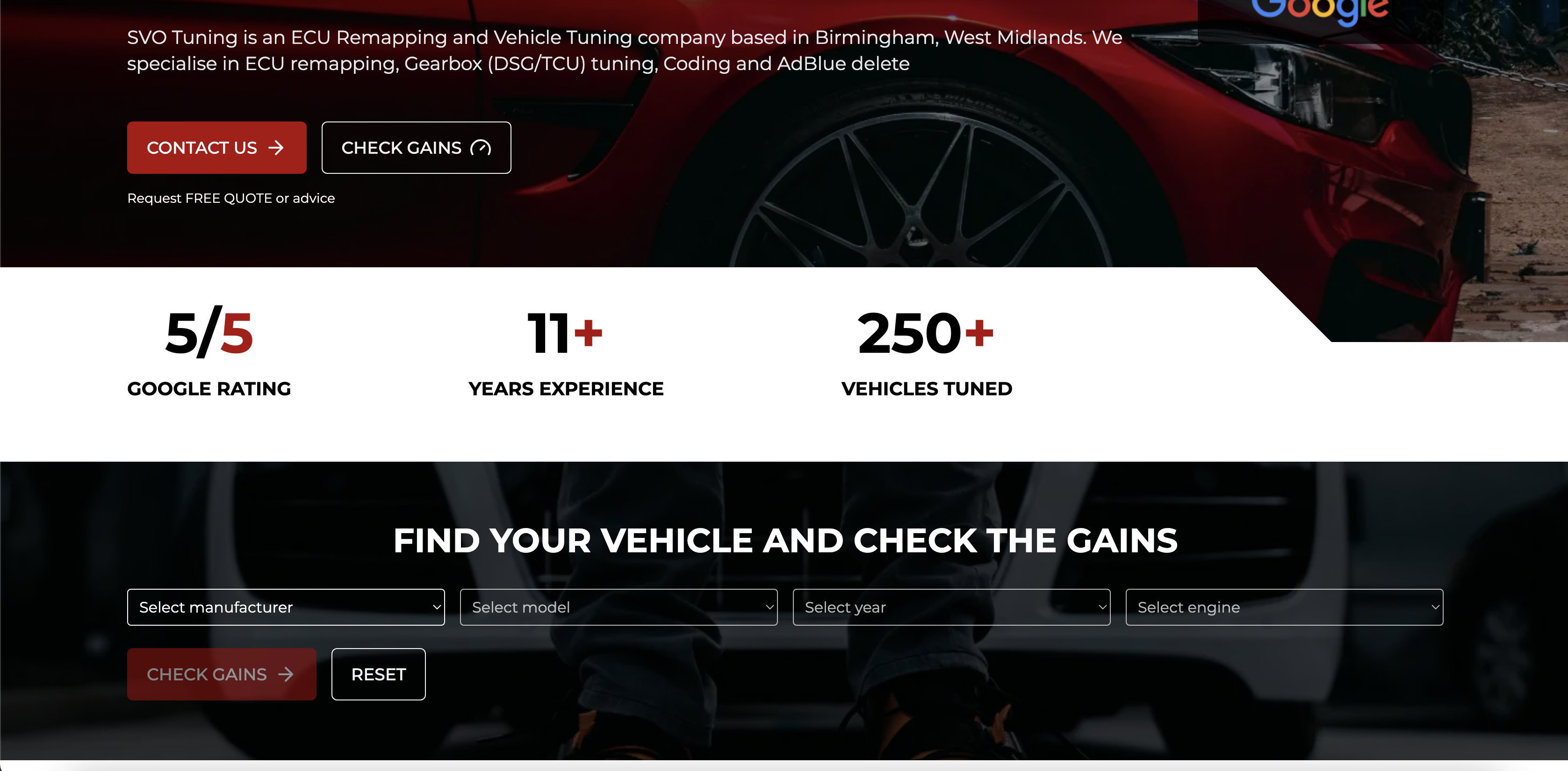 SVO, a car tuning and remapping garage based in Birmingham, approached us to improve their Google Ads performance after struggling with ineffective campaigns. However, upon auditing their existing setup, we quickly identified a critical issue: their website was not designed to convert traffic effectively. It was slow, used a generic template, lacked trust signals, and failed to provide a personal touch - common pitfalls for small and local service-based businesses trying to run Google Ads.